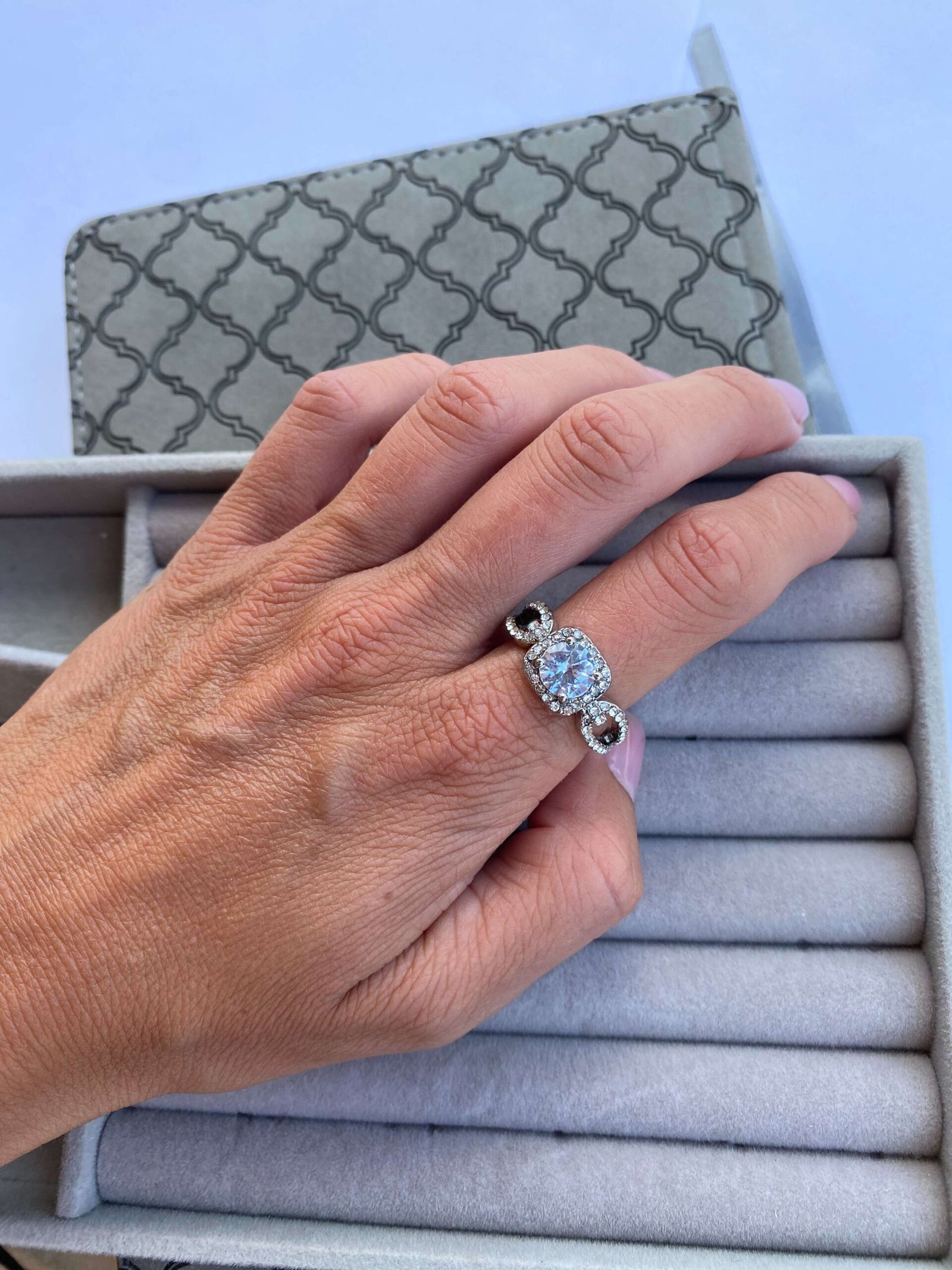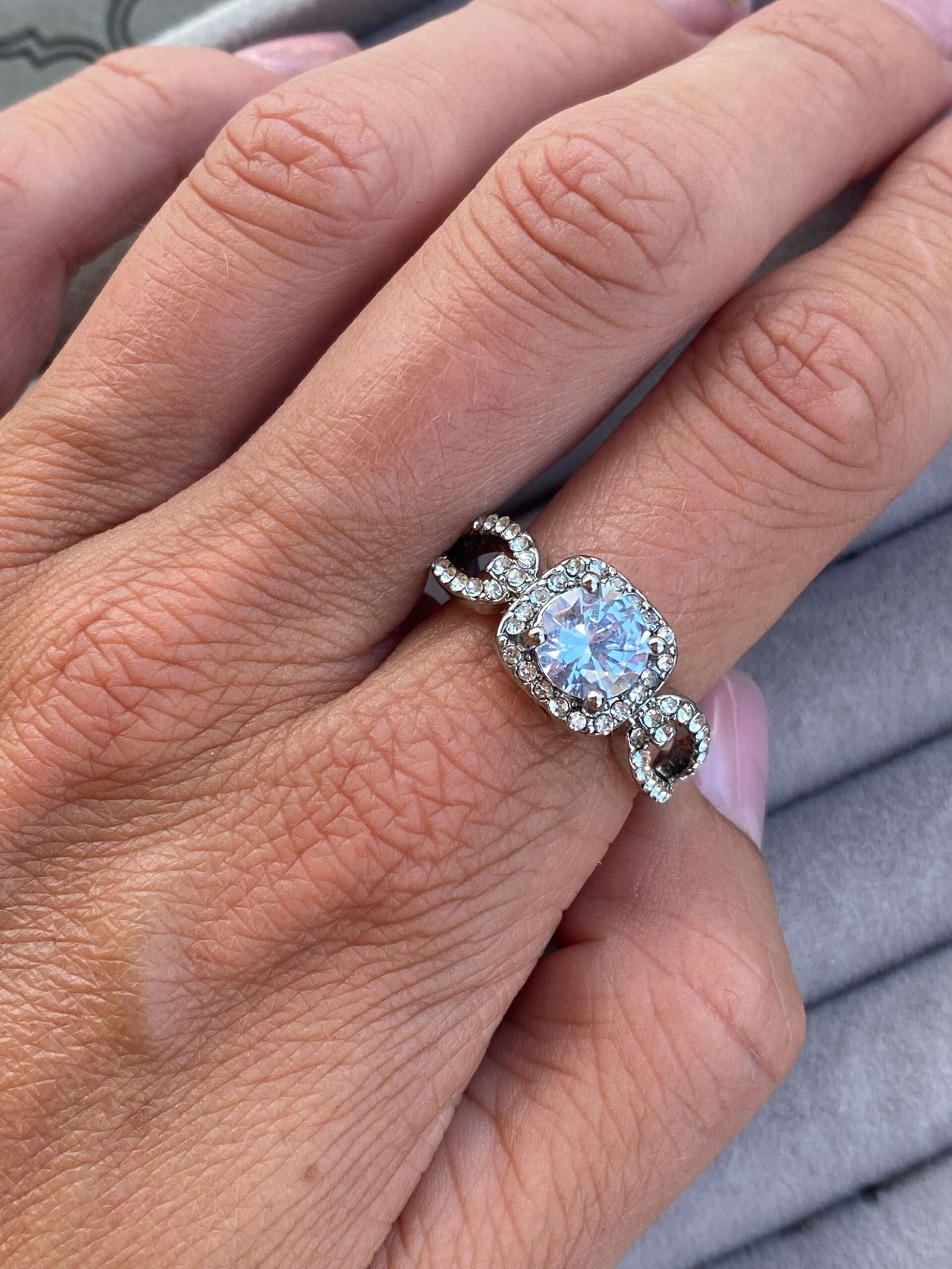 Įspūdingas, žėrintis žiedas, puoštas cirkoniais.